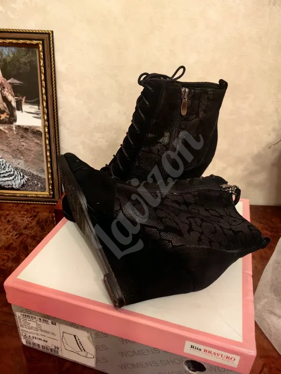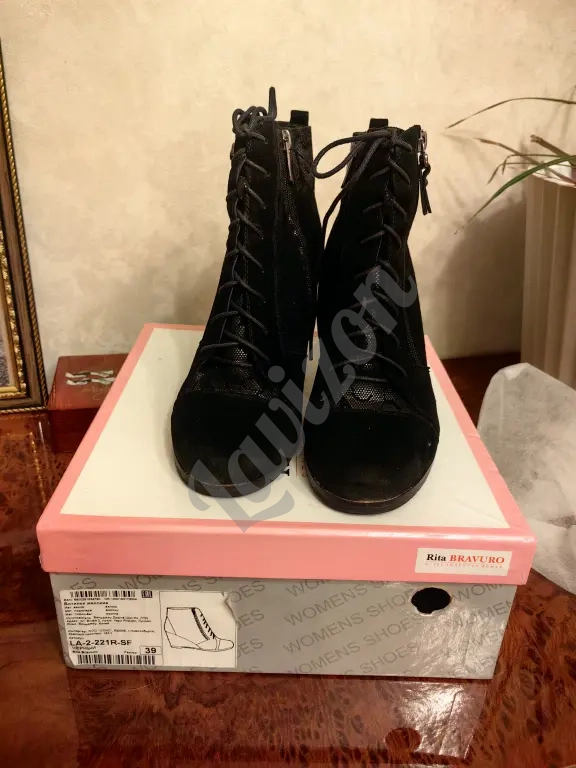 Ботинки женские, в отличном состоянии, размер 39,верх:велюр, чёрного цвета с узорами, высота танкетки 7см, Осень - Весна, фирма : Rita Bravuro